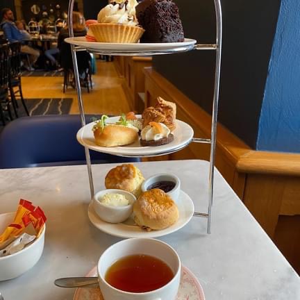Edinburgh Castle. I visited Scotland in March and as I toured the Edinburgh Castle, I noticed a sign for Afternoon Tea next to the castle. It was a drizzly day a top the ancient, massive Castle Rock (an extinct volcano) upon which this fortress was built in 1103. At one in the afternoon, I was surprised that there wasn’t a line for tea on top of one of the biggest tourist attractions in Europe, I jumped at the chance. I had a table next to a window to look at the capital of Edinburgh below and although the ambiance was spare without table clothes or music, the food was lovely with the sandwich tier being the most interesting because they weren’t cut finger sandwiches but a tiny bun filled with egg salad and pumpernickel topped with sour cream and smoked salmon as well as a cheese puff. Perhaps it was the rainy day outside but the Earl Grey Tea was excellent. I highly recommend the experience. And I always get to say that I had tea at the castle!