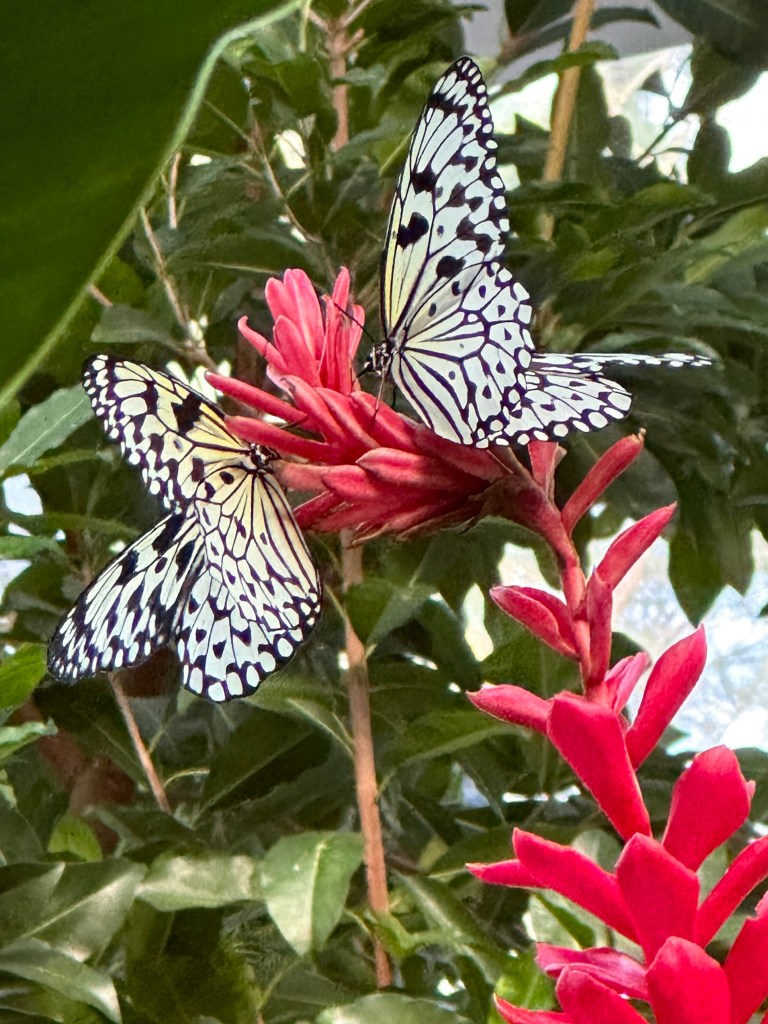 Fast forward 20 years.  I’m much less anxious.  I don’t know what to peg it on besides being older but I do think that being sober, daily meditation and not relying on as much caffeine during the day has had a mellowing effect on my reactions to all things bug related. When I toured Scotland, England and Ireland in early 2023, I was surprised by how many towns and gardens had butterfly houses.  These houses are always warm and humid and, during the rainy spring that is March and April in Great Britain, a butterfly house is an excellent respite. Perhaps it was because I was traveling alone and didn’t have someone expecting me to flinch or panic when a wayward butterfly came dancing by, but I really began to seek them out and enjoy the experience.  In November of 2023, I decided to volunteer at the NC Museum of Life and Science’s Magic Wings Butterfly House. So instead of avoiding bugs, I’ve learned enjoy them.